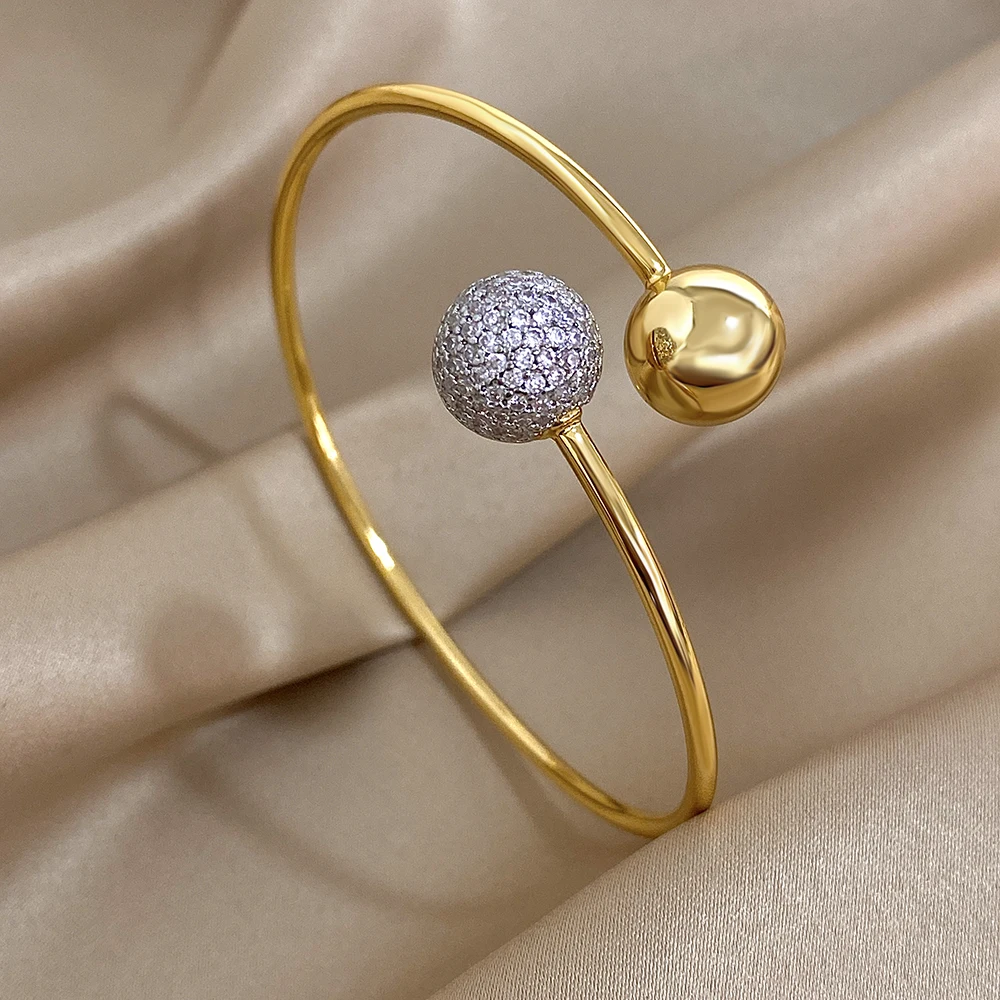 Chaque extrémité du bracelet est ornée de boules raffinées. L’une, lisse et dorée, capte la lumière avec grâce, tandis que l’autre, argentée et décorée de fausses pierres, ajoute une note de glamour. Ce contraste de matériaux et de couleurs fait de ce bracelet un accessoire unique qui saura séduire les esthètes en quête d’originalité.